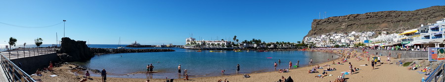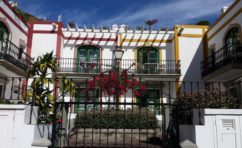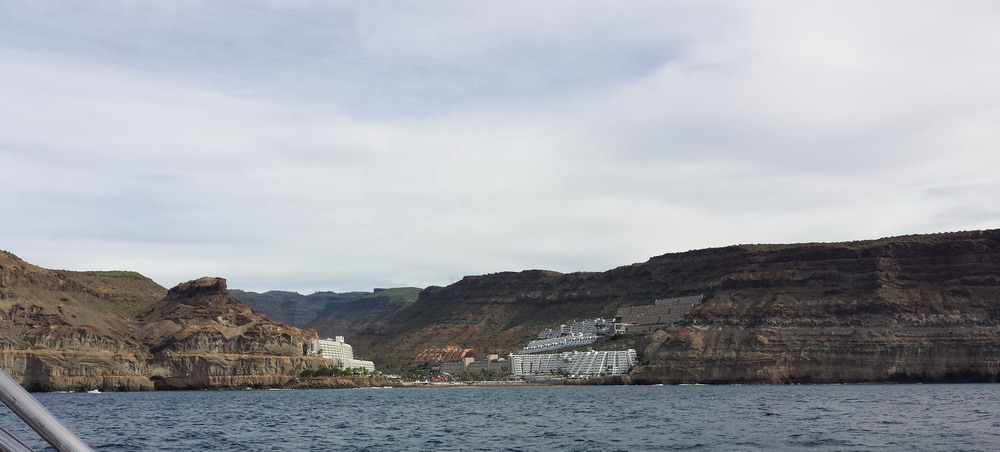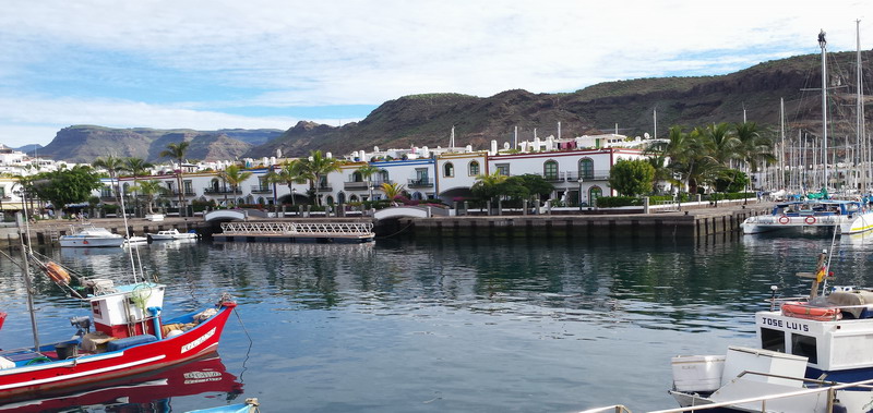 Mogan liegt voraus. Zum Glück ohne hohe Hotelbauten, kleine Appartements, Shops, Geschäfte, kein „All Inclusive“ und kein Massentourismus. Nur im hinteren Teil des Ortes wurden größere Hotelanlagen errichtet, die jedoch das Ortsbild nicht wesentlich verändern.